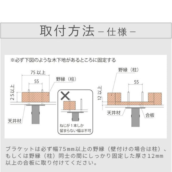 《天井へ取り付ける場合》幅75mm以上の野縁、もしくは野縁同士の間にしっかり固定した厚さ12mm以上の合板に取り付けてください。
