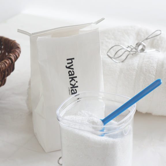 使用量は水30Lにつき小さじ1.5~2(7.5~10g)という少なさ。溶かし込みや浸け置きは不要、すすぎも1回でOK。節水・節電・家事の省力化に役立ちます。